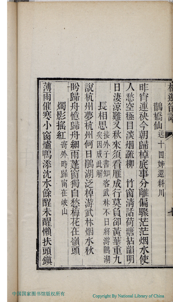 | (PRINT FRIENDLY VERSION) 梅邊笛譜:一卷(清蔣左賢撰)。清光緒十五年(1889)刻本 ![]() 頁碼 : 梅邊笛譜.7b | 点 击 放 大 | 返回 |