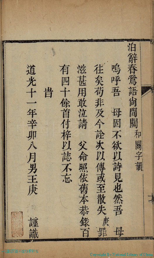| (PRINT FRIENDLY VERSION) 蘭軒未訂稿: 初集一卷,二集一卷(清竇蘭軒撰)。清道光辛卯 (1831)平濼王氏刻本 ![]() 頁碼 : 二集.17b | 点 击 放 大 | 蘭軒未訂稿: 初集一卷,二集一卷(清竇蘭軒撰)。清道光辛卯 (1831)平濼王氏刻本![]() 頁碼 : 二集.17a | 点 击 放 大 | 蘭軒未訂稿: 初集一卷,二集一卷(清竇蘭軒撰)。清道光辛卯 (1831)平濼王氏刻本![]() 頁碼 : 二集.16b | 点 击 放 大 | 返回 |