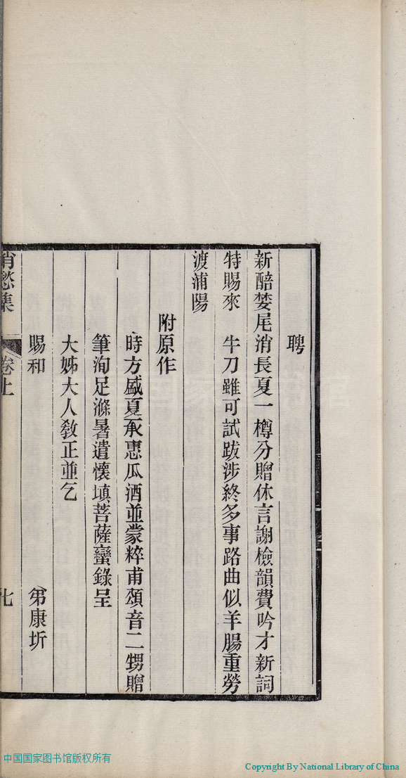 | (PRINT FRIENDLY VERSION) 消愁集:二卷(清蔣英撰)。清光緒三十四年(1908)刻本 ![]() 頁碼 : 1.7a | 点 击 放 大 | 消愁集:二卷(清蔣英撰)。清光緒三十四年(1908)刻本![]() 頁碼 : 1.6b | 点 击 放 大 | 返回 |