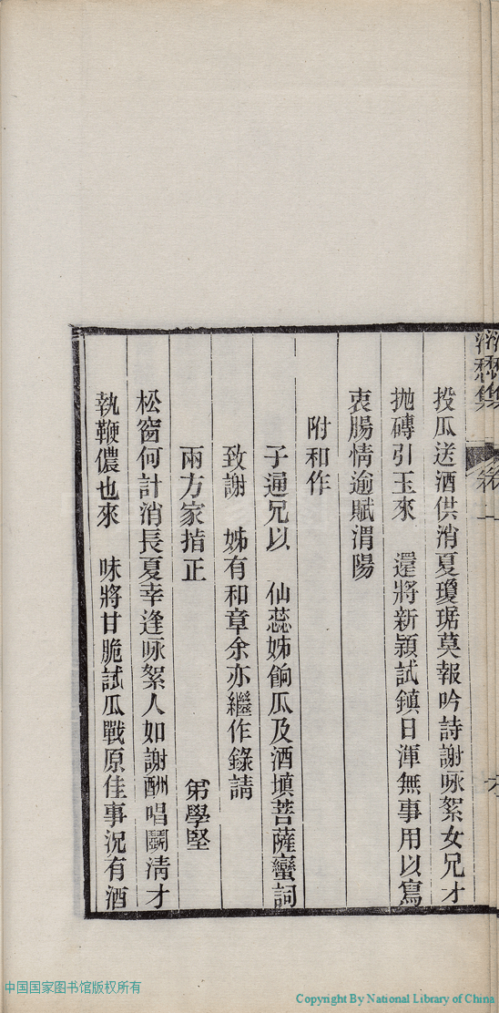 | (PRINT FRIENDLY VERSION) 消愁集:二卷(清蔣英撰)。清光緒三十四年(1908)刻本 ![]() 頁碼 : 1.7b | 点 击 放 大 | 消愁集:二卷(清蔣英撰)。清光緒三十四年(1908)刻本![]() 頁碼 : 1.7a | 点 击 放 大 | 返回 |
