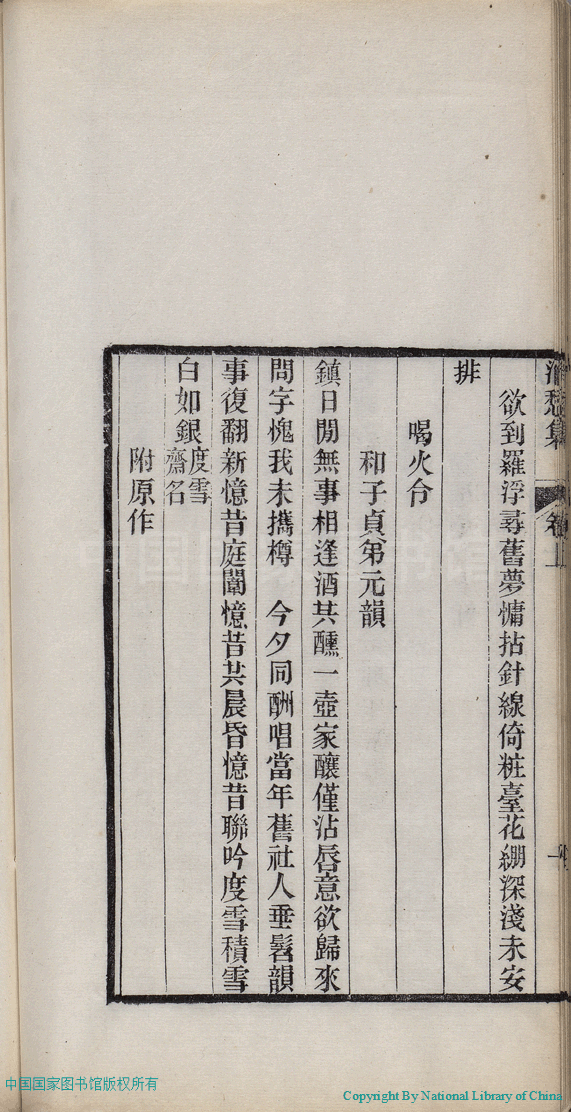 | (PRINT FRIENDLY VERSION) 消愁集:二卷(清蔣英撰)。清光緒三十四年(1908)刻本 ![]() 頁碼 : 1.10b | 点 击 放 大 | 消愁集:二卷(清蔣英撰)。清光緒三十四年(1908)刻本![]() 頁碼 : 1.10a | 点 击 放 大 | 返回 |