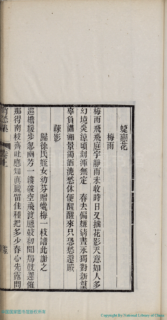 | (PRINT FRIENDLY VERSION) 消愁集:二卷(清蔣英撰)。清光緒三十四年(1908)刻本 ![]() 頁碼 : 1.15b | 点 击 放 大 | 消愁集:二卷(清蔣英撰)。清光緒三十四年(1908)刻本![]() 頁碼 : 1.15a | 点 击 放 大 | 返回 |