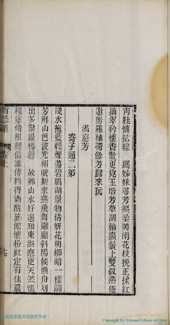 | (PRINT FRIENDLY VERSION) 消愁集:二卷(清蔣英撰)。清光緒三十四年(1908)刻本 ![]() 頁碼 : 1.17a | 点 击 放 大 | 消愁集:二卷(清蔣英撰)。清光緒三十四年(1908)刻本![]() 頁碼 : 1.16b | 点 击 放 大 | 返回 |