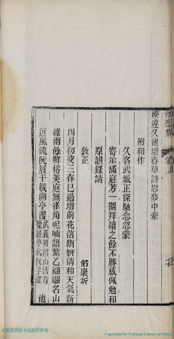 | (PRINT FRIENDLY VERSION) 消愁集:二卷(清蔣英撰)。清光緒三十四年(1908)刻本 ![]() 頁碼 : 1.18a | 点 击 放 大 | 消愁集:二卷(清蔣英撰)。清光緒三十四年(1908)刻本![]() 頁碼 : 1.17b | 点 击 放 大 | 返回 |