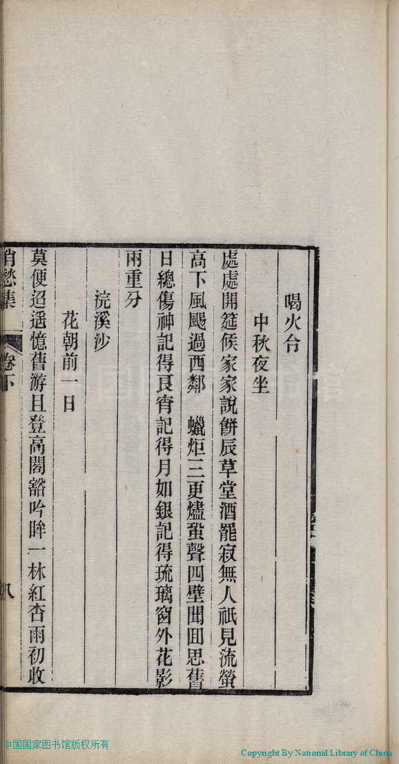 | (PRINT FRIENDLY VERSION) 消愁集:二卷(清蔣英撰)。清光緒三十四年(1908)刻本 ![]() 頁碼 : 2.8b | 点 击 放 大 | 消愁集:二卷(清蔣英撰)。清光緒三十四年(1908)刻本![]() 頁碼 : 2.8a | 点 击 放 大 | 返回 |