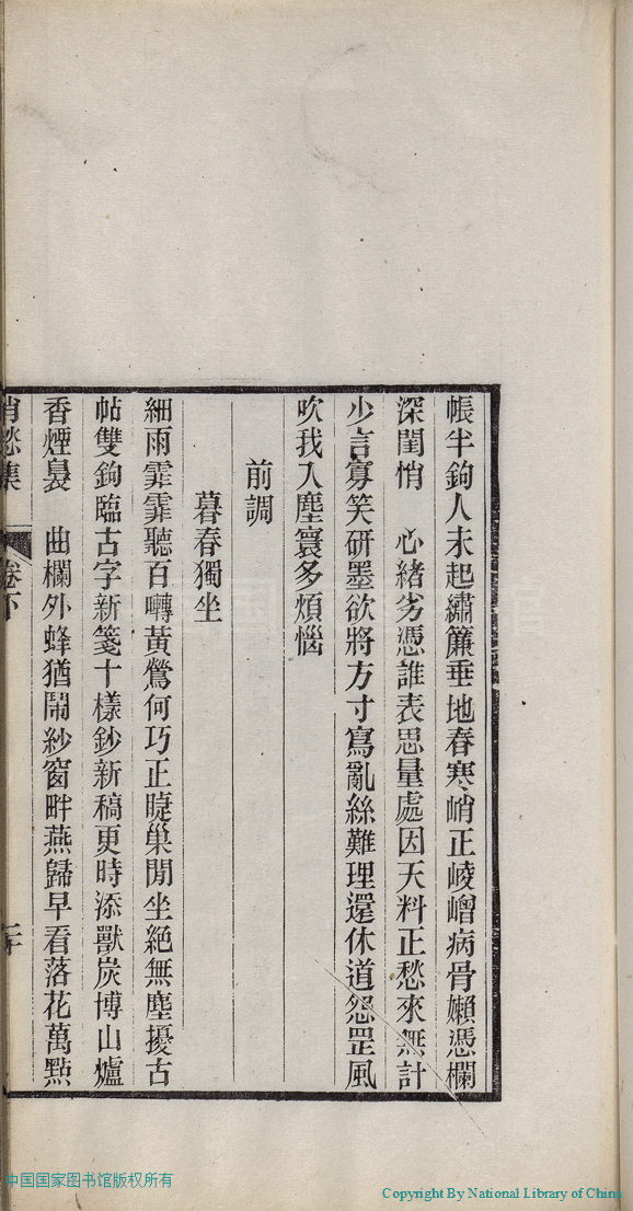 | (PRINT FRIENDLY VERSION) 消愁集:二卷(清蔣英撰)。清光緒三十四年(1908)刻本 ![]() 頁碼 : 2.20b | 点 击 放 大 | 消愁集:二卷(清蔣英撰)。清光緒三十四年(1908)刻本![]() 頁碼 : 2.20a | 点 击 放 大 | 返回 |