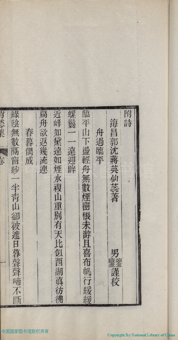 | (PRINT FRIENDLY VERSION) 消愁集:二卷(清蔣英撰)。清光緒三十四年(1908)刻本 ![]() 頁碼 : 附詩.1a | 点 击 放 大 | 返回 |