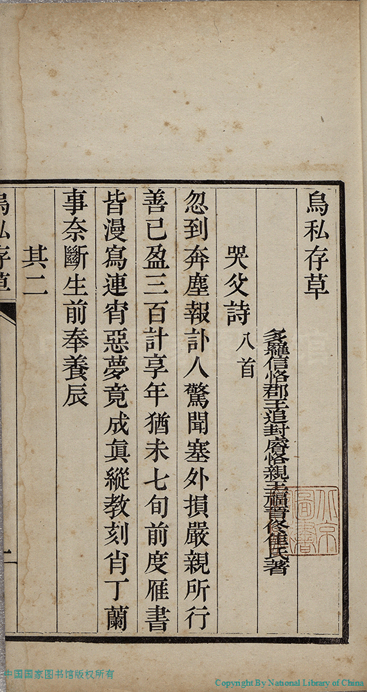 烏私存草:一卷(清佟佳氏撰)。清乾隆四十一年(1776)刻本