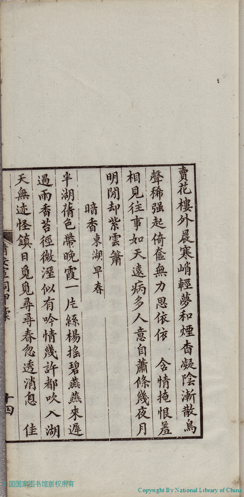 | (PRINT FRIENDLY VERSION) 清安室詞:二卷(清張清揚撰)。民國十年(1921)福州刻本 ![]() 頁碼 : 甲稿.14a | 点 击 放 大 | 清安室詞:二卷(清張清揚撰)。民國十年(1921)福州刻本![]() 頁碼 : 甲稿.13b | 点 击 放 大 | 返回 |