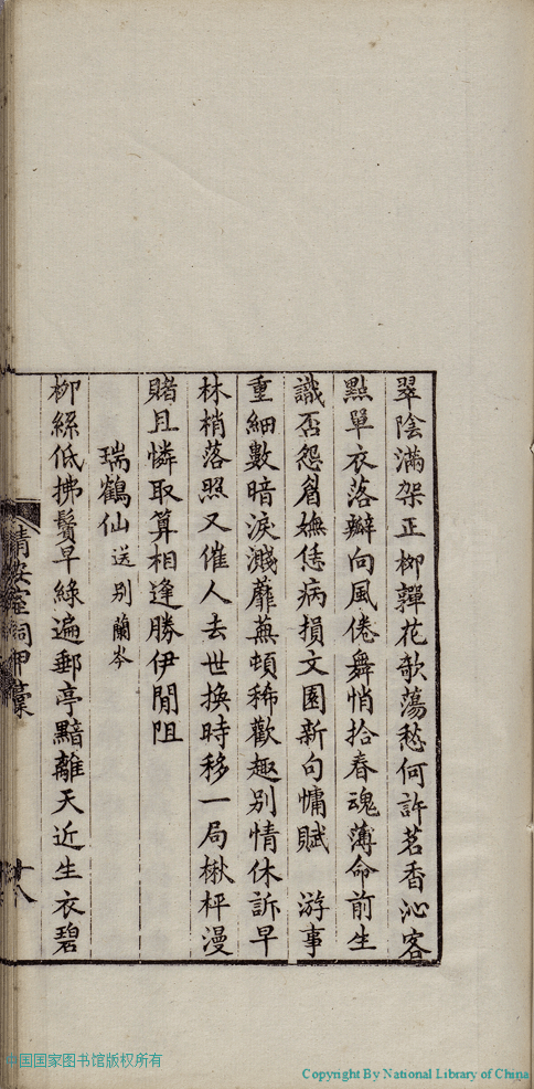 | (PRINT FRIENDLY VERSION) 清安室詞:二卷(清張清揚撰)。民國十年(1921)福州刻本 ![]() 頁碼 : 甲稿.18b | 点 击 放 大 | 清安室詞:二卷(清張清揚撰)。民國十年(1921)福州刻本![]() 頁碼 : 甲稿.18a | 点 击 放 大 | 返回 |