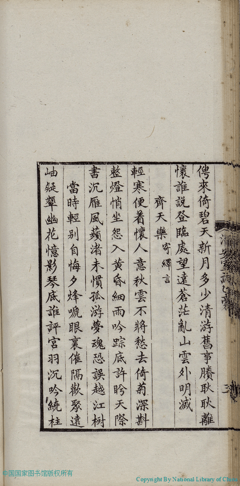 | (PRINT FRIENDLY VERSION) 清安室詞:二卷(清張清揚撰)。民國十年(1921)福州刻本 ![]() 頁碼 : 乙稿.4a | 点 击 放 大 | 清安室詞:二卷(清張清揚撰)。民國十年(1921)福州刻本![]() 頁碼 : 乙稿.3b | 点 击 放 大 | 返回 |