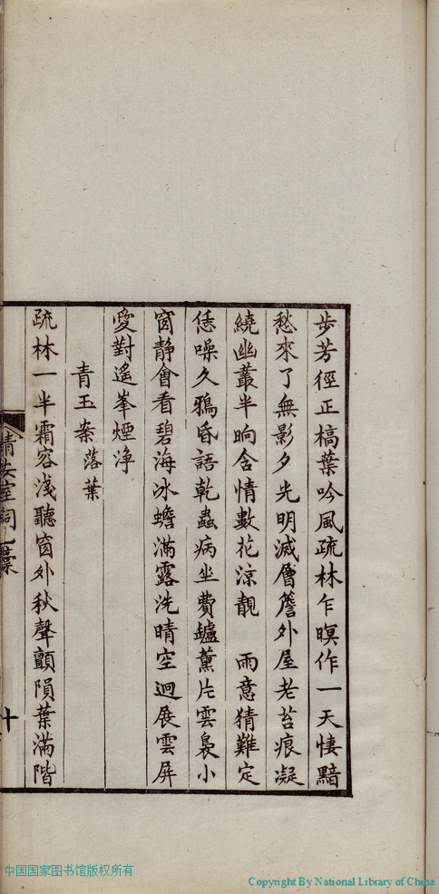 | (PRINT FRIENDLY VERSION) 清安室詞:二卷(清張清揚撰)。民國十年(1921)福州刻本 ![]() 頁碼 : 乙稿.10b | 点 击 放 大 | 清安室詞:二卷(清張清揚撰)。民國十年(1921)福州刻本![]() 頁碼 : 乙稿.10a | 点 击 放 大 | 返回 |