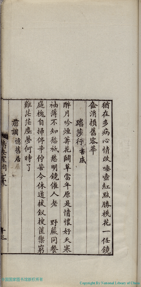 | (PRINT FRIENDLY VERSION) 清安室詞:二卷(清張清揚撰)。民國十年(1921)福州刻本 ![]() 頁碼 : 乙稿.13a | 点 击 放 大 | 清安室詞:二卷(清張清揚撰)。民國十年(1921)福州刻本![]() 頁碼 : 乙稿.12b | 点 击 放 大 | 返回 |