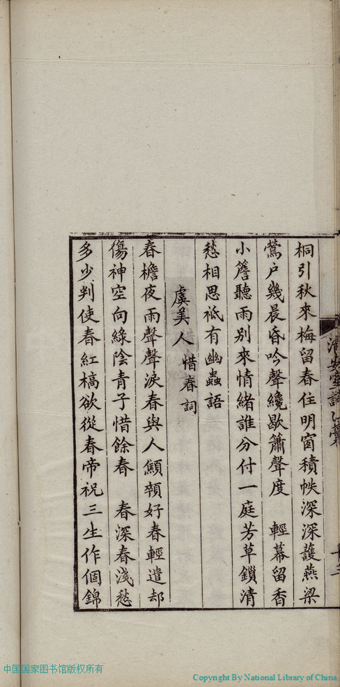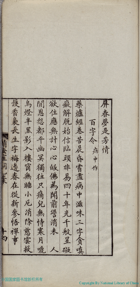 | (PRINT FRIENDLY VERSION) 清安室詞:二卷(清張清揚撰)。民國十年(1921)福州刻本 ![]() 頁碼 : 乙稿.14a | 点 击 放 大 | 清安室詞:二卷(清張清揚撰)。民國十年(1921)福州刻本![]() 頁碼 : 乙稿.13b | 点 击 放 大 | 返回 |
