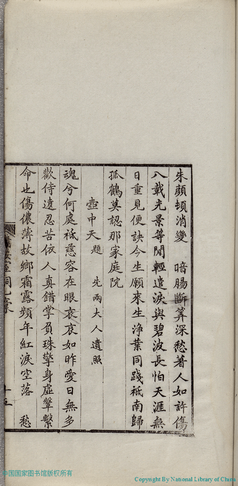 | (PRINT FRIENDLY VERSION) 清安室詞:二卷(清張清揚撰)。民國十年(1921)福州刻本 ![]() 頁碼 : 乙稿.15a | 点 击 放 大 | 清安室詞:二卷(清張清揚撰)。民國十年(1921)福州刻本![]() 頁碼 : 乙稿.14b | 点 击 放 大 | 返回 |