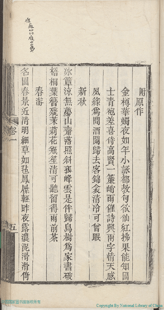 | (PRINT FRIENDLY VERSION) 歲寒吟:二卷,附詩餘(清彭若梅撰)。清光緒27年(1901)江右述經樓刻本 ![]() 頁碼 : 1.5b | 点 击 放 大 | 歲寒吟:二卷,附詩餘(清彭若梅撰)。清光緒27年(1901)江右述經樓刻本 ![]() 頁碼 : 1.5a | 点 击 放 大 | 返回 |