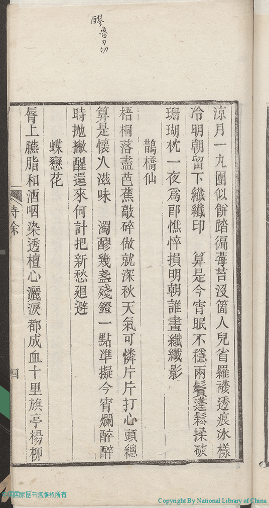 | (PRINT FRIENDLY VERSION) 歲寒吟:二卷,附詩餘(清彭若梅撰)。清光緒27年(1901)江右述經樓刻本 ![]() 頁碼 : 詩餘.4a | 点 击 放 大 | 歲寒吟:二卷,附詩餘(清彭若梅撰)。清光緒27年(1901)江右述經樓刻本 ![]() 頁碼 : 詩餘.3b | 点 击 放 大 | 返回 |