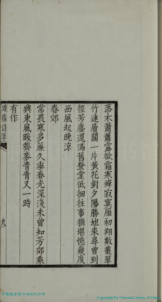 | (PRINT FRIENDLY VERSION) 璞廬詩草:一卷(清汪華熙撰) 。民國11年(1922)文楷齋刻本 ![]() 頁碼 : 詩.9a | 点 击 放 大 | 璞廬詩草:一卷(清汪華熙撰) 。民國11年(1922)文楷齋刻本![]() 頁碼 : 詩.8b | 点 击 放 大 | 返回 |