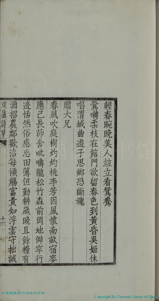 | (PRINT FRIENDLY VERSION) 璞廬詩草:一卷(清汪華熙撰) 。民國11年(1922)文楷齋刻本 ![]() 頁碼 : 詩.11b | 点 击 放 大 | 璞廬詩草:一卷(清汪華熙撰) 。民國11年(1922)文楷齋刻本![]() 頁碼 : 詩.11a | 点 击 放 大 | 返回 |