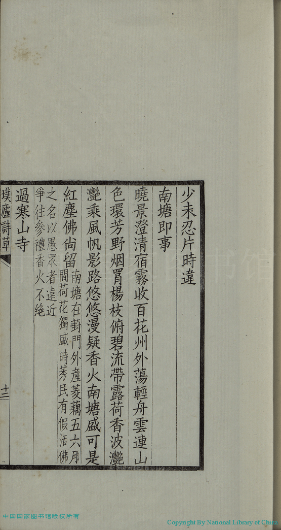 | (PRINT FRIENDLY VERSION) 璞廬詩草:一卷(清汪華熙撰) 。民國11年(1922)文楷齋刻本 ![]() 頁碼 : 詩.12b | 点 击 放 大 | 璞廬詩草:一卷(清汪華熙撰) 。民國11年(1922)文楷齋刻本![]() 頁碼 : 詩.12a | 点 击 放 大 | 返回 |