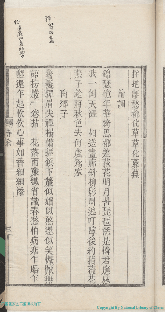 | (PRINT FRIENDLY VERSION) 歲寒吟:二卷,附詩餘(清彭若梅撰)。清光緒27年(1901)江右述經樓刻本 ![]() 頁碼 : 詩餘.3a | 点 击 放 大 | 歲寒吟:二卷,附詩餘(清彭若梅撰)。清光緒27年(1901)江右述經樓刻本 ![]() 頁碼 : 詩餘.2b | 点 击 放 大 | 返回 |