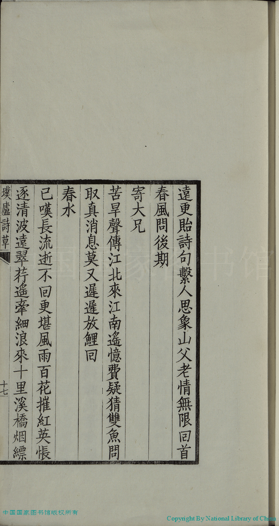 | (PRINT FRIENDLY VERSION) 璞廬詩草:一卷(清汪華熙撰) 。民國11年(1922)文楷齋刻本 ![]() 頁碼 : 詩.17a | 点 击 放 大 | 返回 |