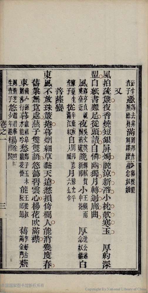 | (PRINT FRIENDLY VERSION) 麝塵蓮寸集:五卷(清汪淵撰; 程淑注)。清光緒十六年(1890)庚寅染翰齋刻本 ![]() 頁碼 : 1.3a | 点 击 放 大 | 返回 |