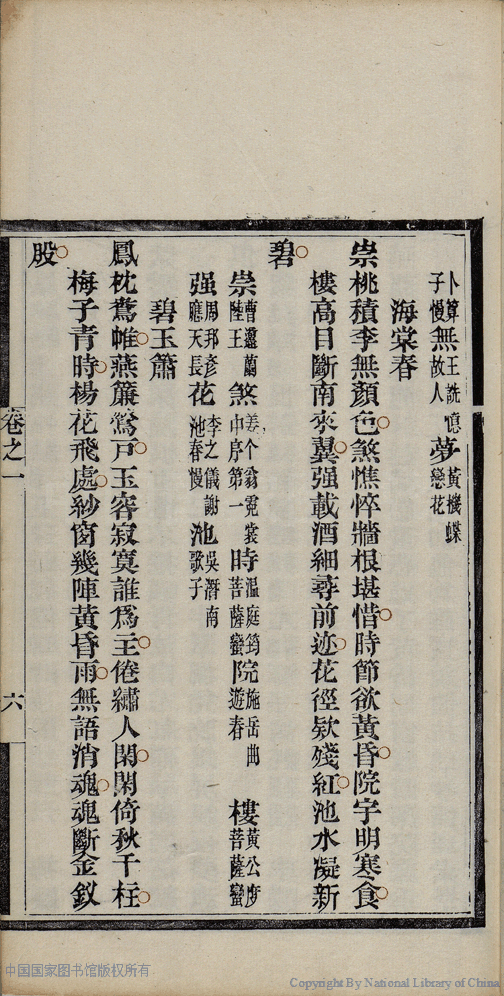 | (PRINT FRIENDLY VERSION) 麝塵蓮寸集:五卷(清汪淵撰; 程淑注)。清光緒十六年(1890)庚寅染翰齋刻本 ![]() 頁碼 : 1.6a | 点 击 放 大 | 返回 |
