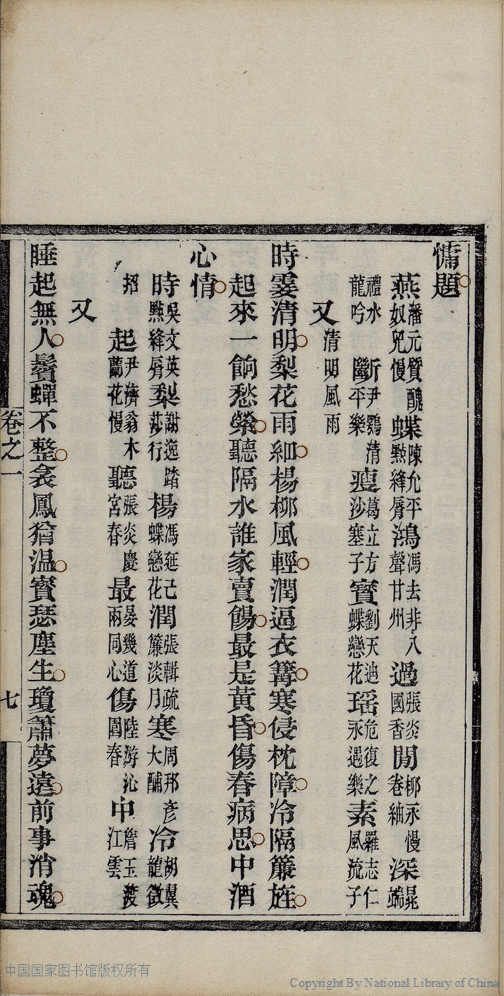 | (PRINT FRIENDLY VERSION) 麝塵蓮寸集:五卷(清汪淵撰; 程淑注)。清光緒十六年(1890)庚寅染翰齋刻本 ![]() 頁碼 : 1.7a | 点 击 放 大 | 返回 |