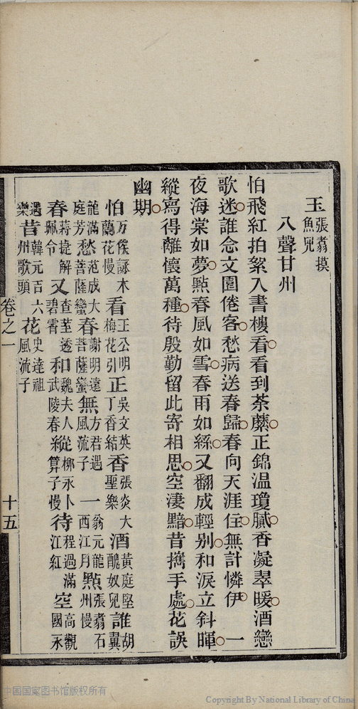 | (PRINT FRIENDLY VERSION) 麝塵蓮寸集:五卷(清汪淵撰; 程淑注)。清光緒十六年(1890)庚寅染翰齋刻本 ![]() 頁碼 : 1.15a | 点 击 放 大 | 返回 |
