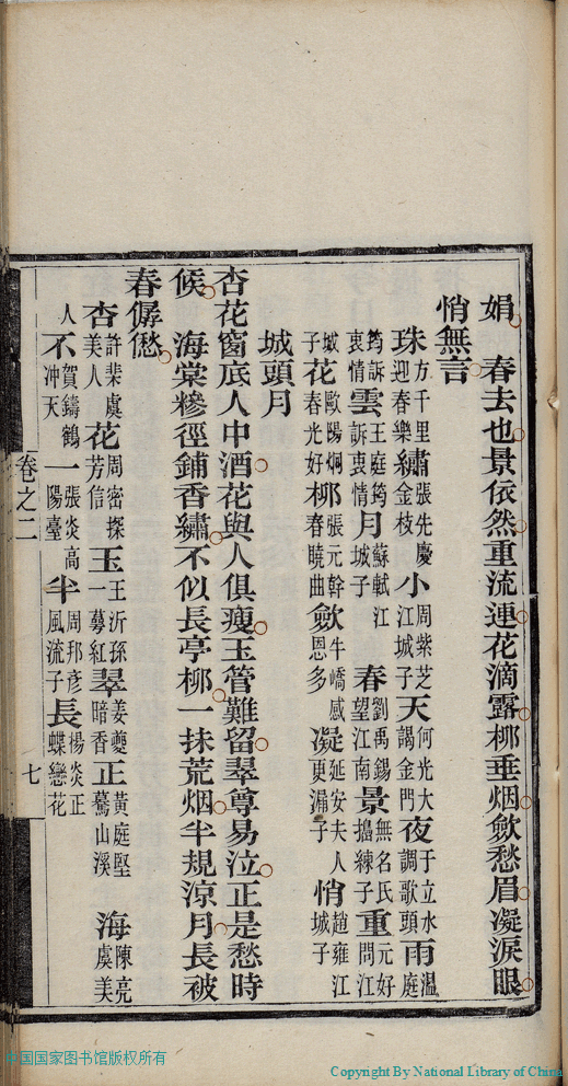 | (PRINT FRIENDLY VERSION) 麝塵蓮寸集:五卷(清汪淵撰; 程淑注)。清光緒十六年(1890)庚寅染翰齋刻本 ![]() 頁碼 : 2.7a | 点 击 放 大 | 返回 |