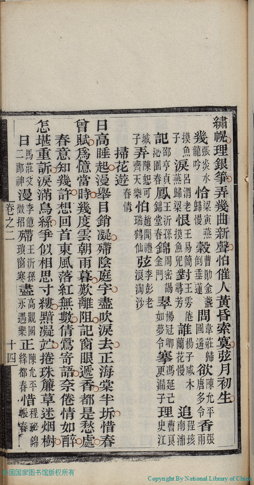 | (PRINT FRIENDLY VERSION) 麝塵蓮寸集:五卷(清汪淵撰; 程淑注)。清光緒十六年(1890)庚寅染翰齋刻本 ![]() 頁碼 : 2.14a | 点 击 放 大 | 返回 |