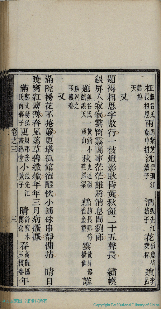 | (PRINT FRIENDLY VERSION) 麝塵蓮寸集:五卷(清汪淵撰; 程淑注)。清光緒十六年(1890)庚寅染翰齋刻本 ![]() 頁碼 : 3.3a | 点 击 放 大 | 返回 |
