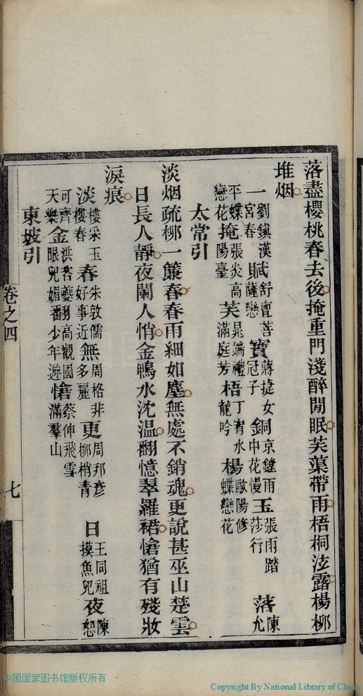 | (PRINT FRIENDLY VERSION) 麝塵蓮寸集:五卷(清汪淵撰; 程淑注)。清光緒十六年(1890)庚寅染翰齋刻本 ![]() 頁碼 : 4.7a | 点 击 放 大 | 返回 |