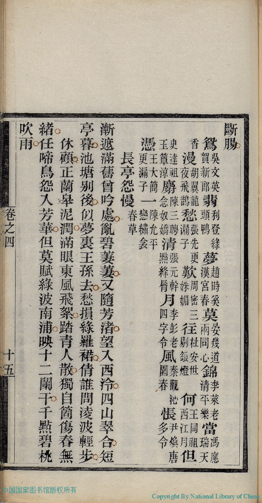 | (PRINT FRIENDLY VERSION) 麝塵蓮寸集:五卷(清汪淵撰; 程淑注)。清光緒十六年(1890)庚寅染翰齋刻本 ![]() 頁碼 : 4.15a | 点 击 放 大 | 返回 |