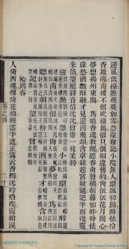 | (PRINT FRIENDLY VERSION) 麝塵蓮寸集:五卷(清汪淵撰; 程淑注)。清光緒十六年(1890)庚寅染翰齋刻本 ![]() 頁碼 : 4.20a | 点 击 放 大 | 返回 |
