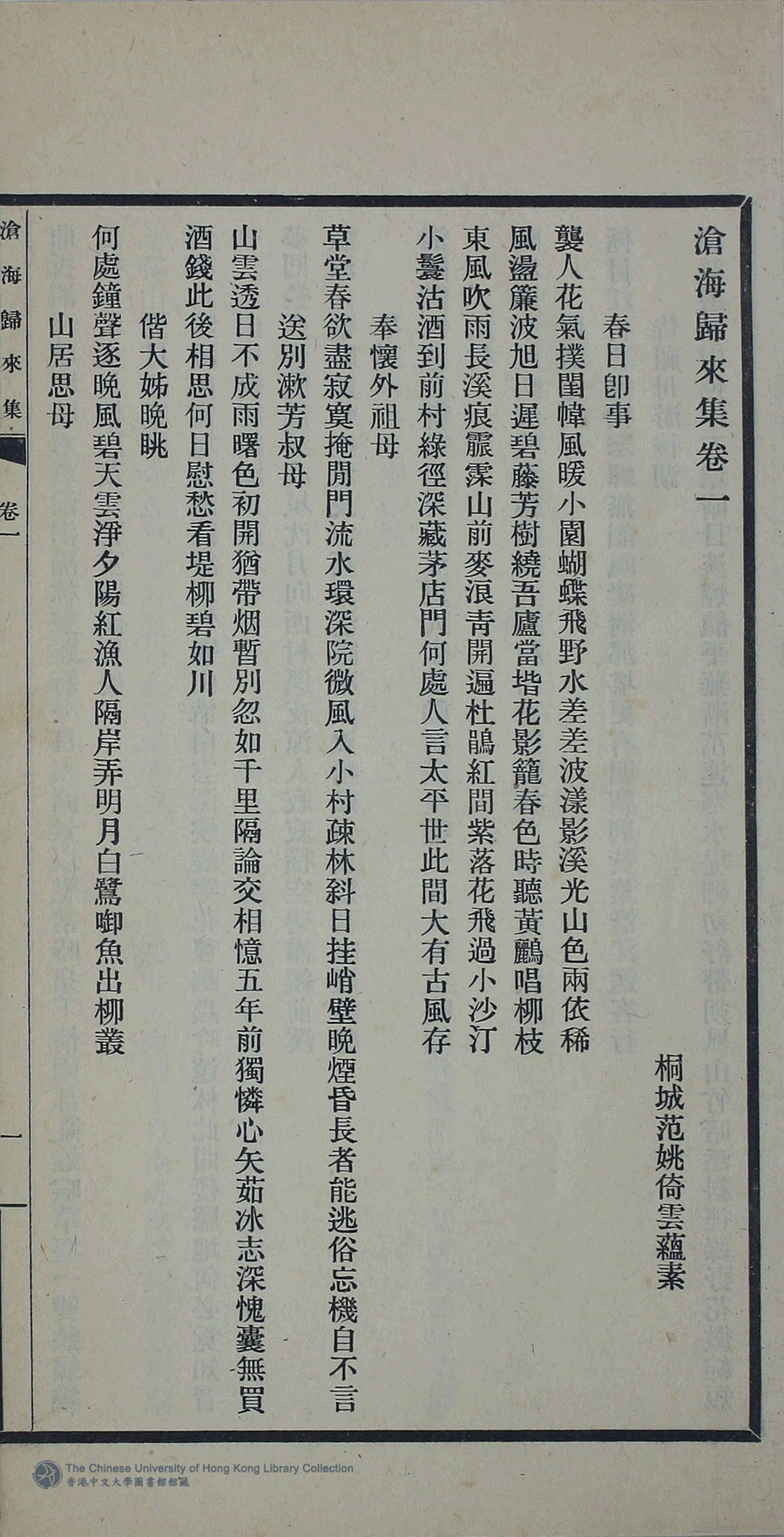 | 原書: 滄海歸來集:詩十一卷,詞一卷,續集一卷,餘卷二卷,消愁吟二卷,文一卷(清姚倚雲撰) |