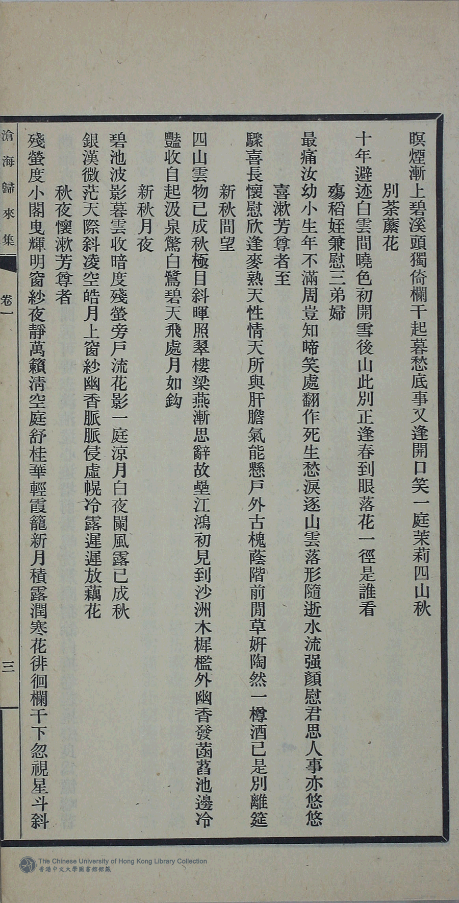 | (PRINT FRIENDLY VERSION) 滄海歸來集:詩十一卷,詞一卷,續集一卷,餘卷二卷,消愁吟二卷,文一卷(清姚倚雲撰)。民國三十三年(1944)或其後排印本 ![]() 頁碼 : 詩1.3b | 点 击 放 大 | 滄海歸來集:詩十一卷,詞一卷,續集一卷,餘卷二卷,消愁吟二卷,文一卷(清姚倚雲撰)。民國三十三年(1944)或其後排印本![]() 頁碼 : 詩1.3a | 点 击 放 大 | 返回 |