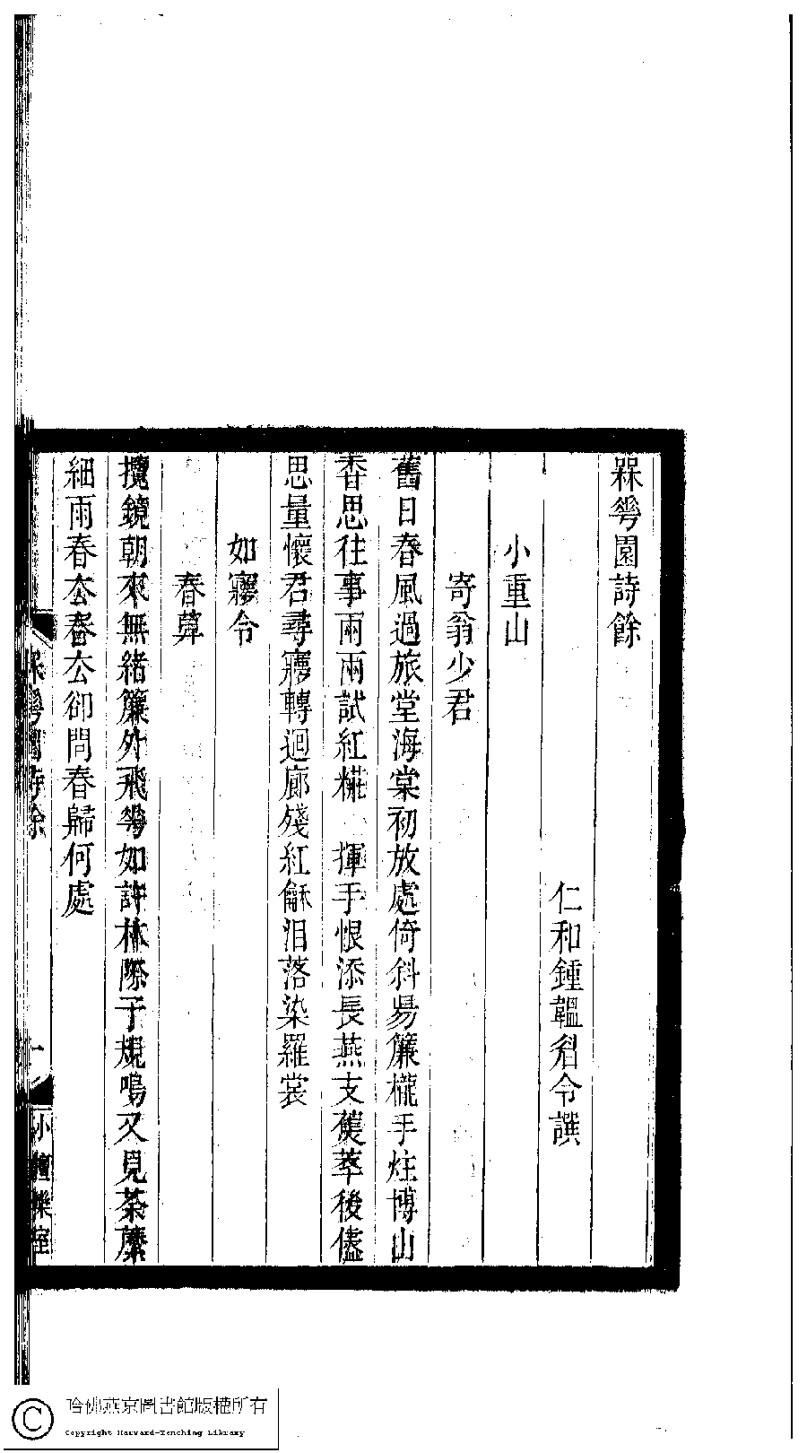 | 原書: 小檀欒室彙刻閨秀詞﹕十集一百種一百卷(清徐乃昌輯): 梅花園詩餘﹕一卷 |