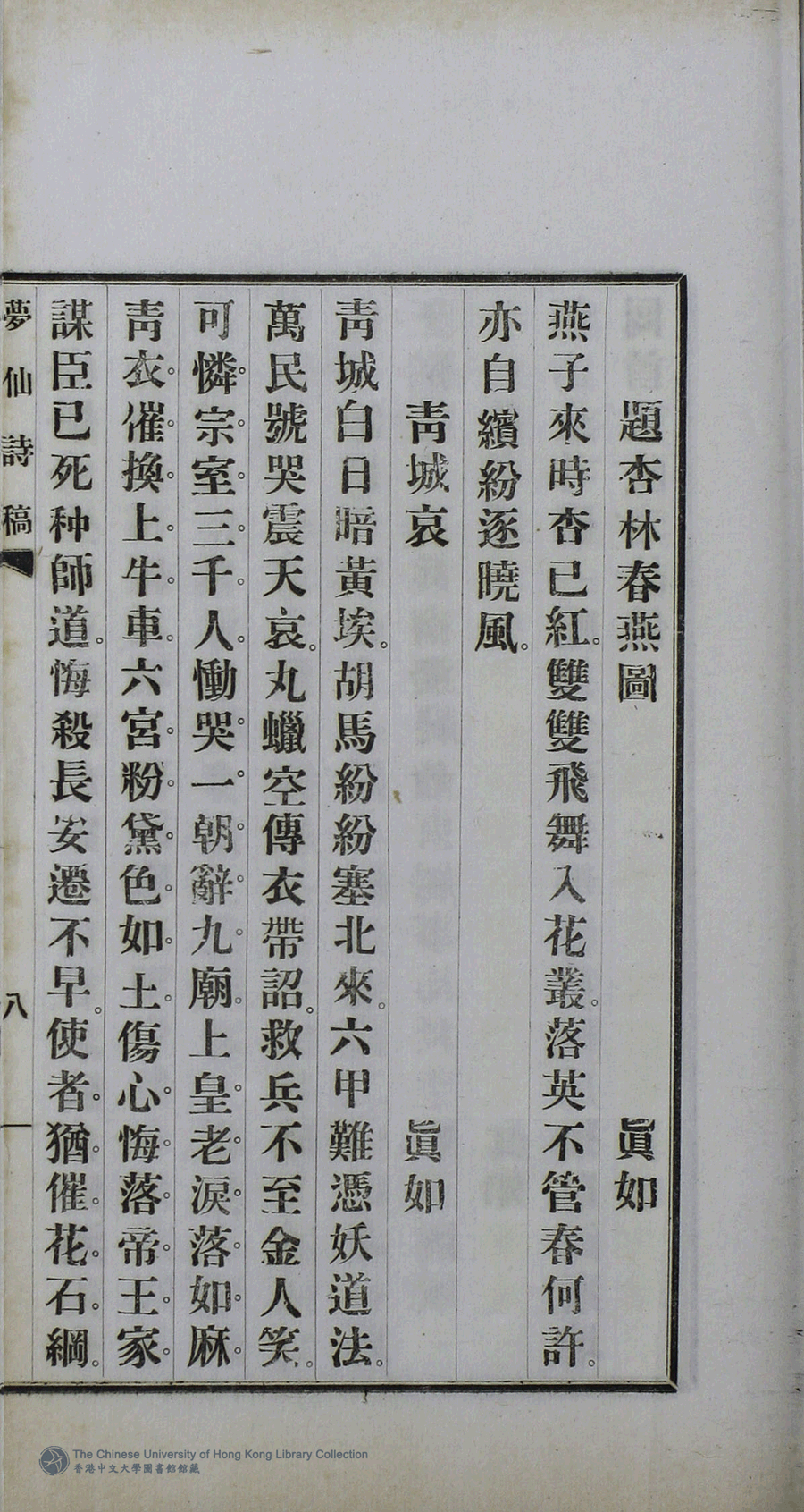 | (PRINT FRIENDLY VERSION) 夢僊詩稿:一卷, 續集: 一卷(清孫雲著)。民國十三年(1924)排印本 ![]() 頁碼 : Page 209 | 点 击 放 大 | 返回 |