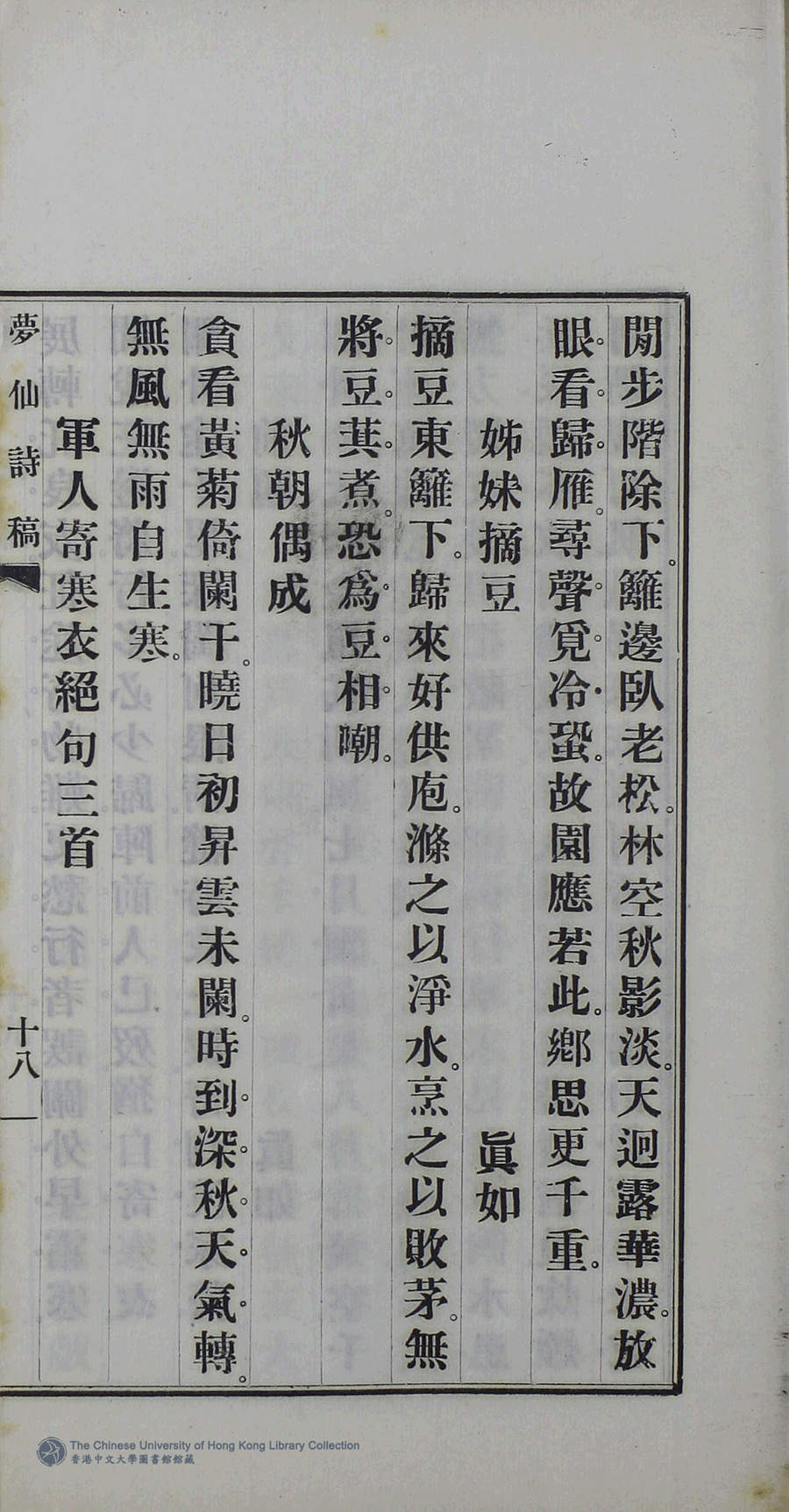 | (PRINT FRIENDLY VERSION) 夢僊詩稿:一卷, 續集: 一卷(清孫雲著)。民國十三年(1924)排印本 ![]() 頁碼 : Page 229 | 点 击 放 大 | 返回 |