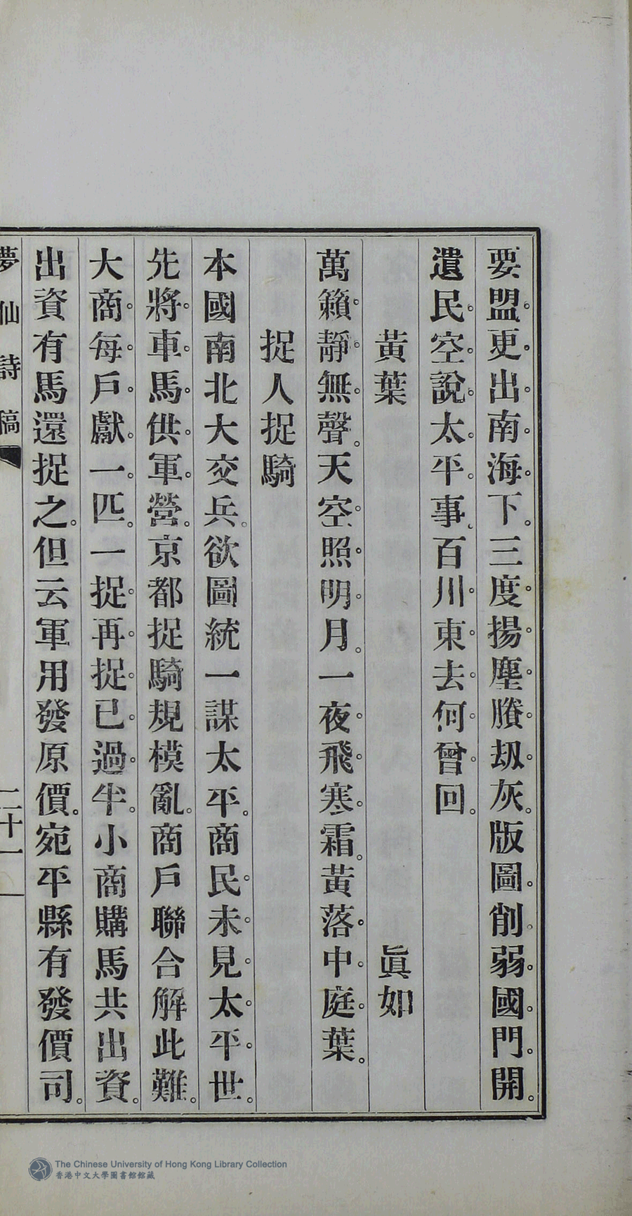 | (PRINT FRIENDLY VERSION) 夢僊詩稿:一卷, 續集: 一卷(清孫雲著)。民國十三年(1924)排印本 ![]() 頁碼 : Page 235 | 点 击 放 大 | 夢僊詩稿:一卷, 續集: 一卷(清孫雲著)。民國十三年(1924)排印本![]() 頁碼 : Page 234 | 点 击 放 大 | 返回 |