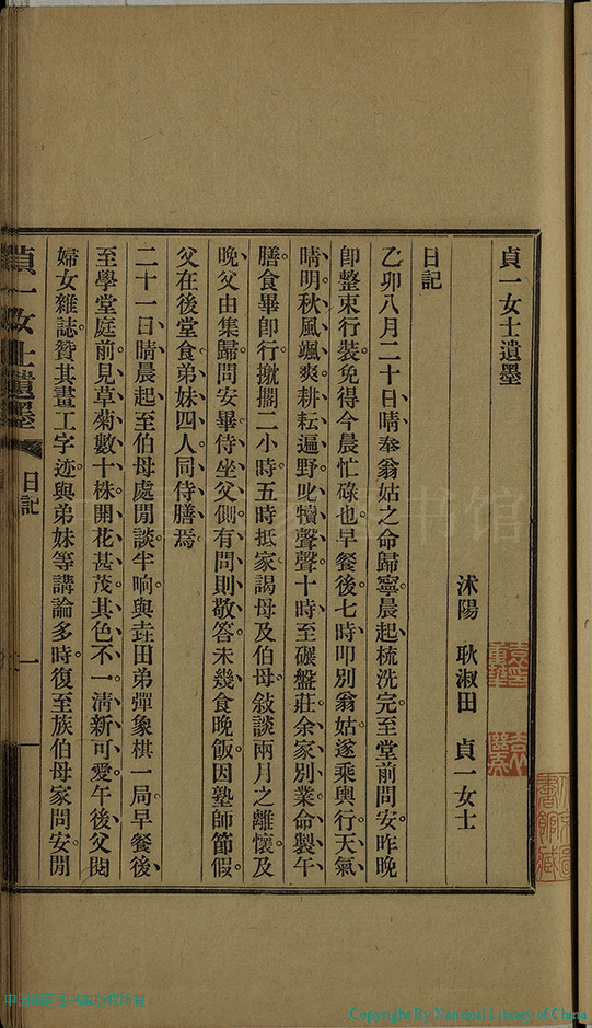 貞一女士遺墨:一卷(清耿淑田撰) 。民國十一年(1922)國光書局鉛印本