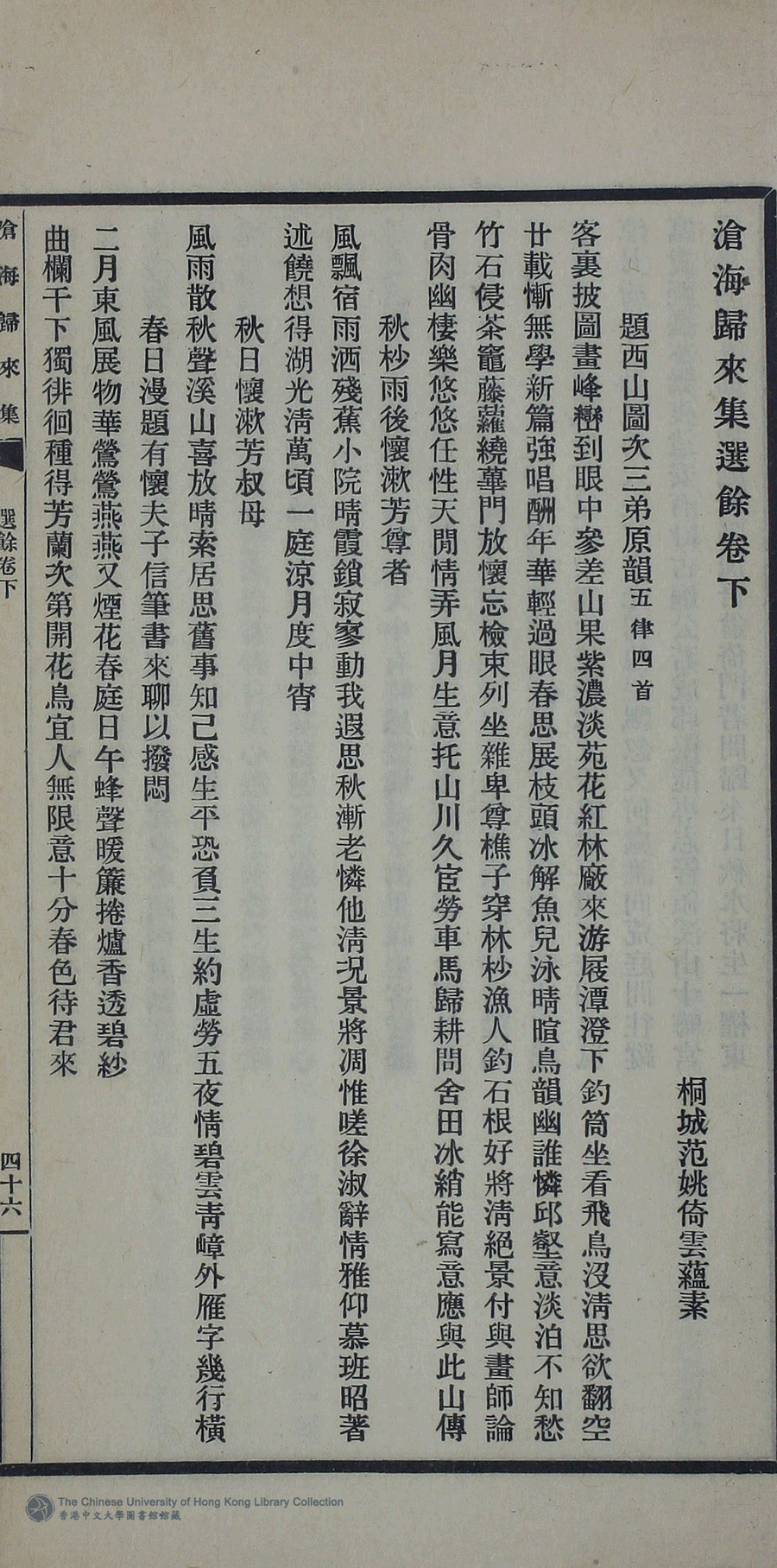 | 原書: 滄海歸來集:詩十一卷,詞一卷,續集一卷,餘卷二卷,消愁吟二卷,文一卷(清姚倚雲撰) |