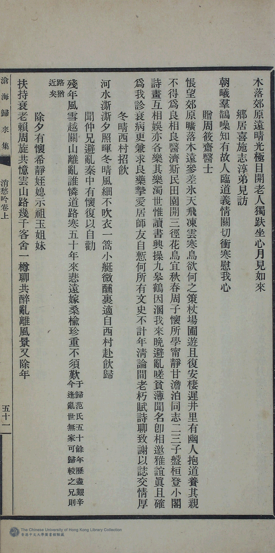 | (PRINT FRIENDLY VERSION) 滄海歸來集:詩十一卷,詞一卷,續集一卷,餘卷二卷,消愁吟二卷,文一卷(清姚倚雲撰)。民國三十三年(1944)或其後排印本 ![]() 頁碼 : 消愁吟卷上.51a | 点 击 放 大 | 返回 |