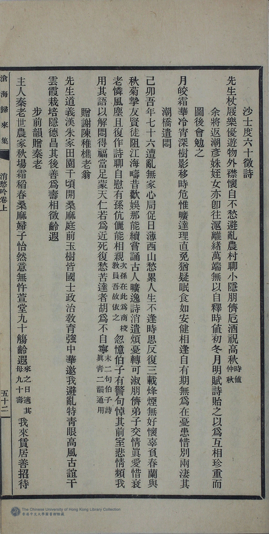 | (PRINT FRIENDLY VERSION) 滄海歸來集:詩十一卷,詞一卷,續集一卷,餘卷二卷,消愁吟二卷,文一卷(清姚倚雲撰)。民國三十三年(1944)或其後排印本 ![]() 頁碼 : 消愁吟卷上. 52a | 点 击 放 大 | 返回 |