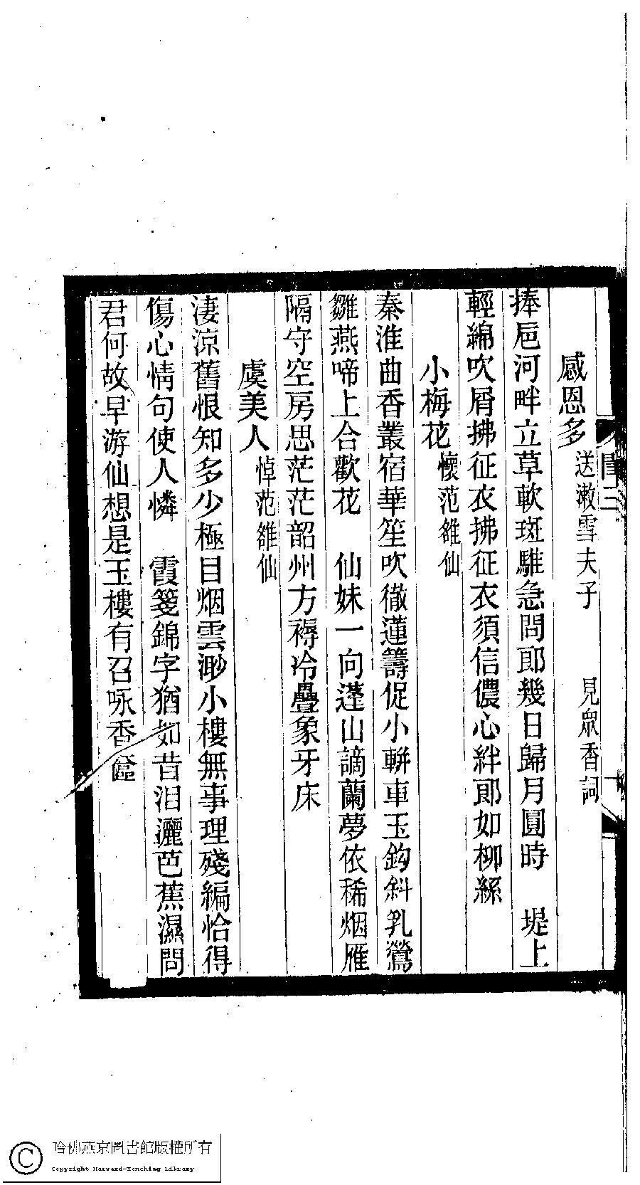 | (PRINT FRIENDLY VERSION) 閨秀詞鈔﹕十六卷(清徐乃昌輯)。清宣統元年(1909)小檀欒室刻本。 ![]() 頁碼 : 3.10b | 点 击 放 大 | 返回 |