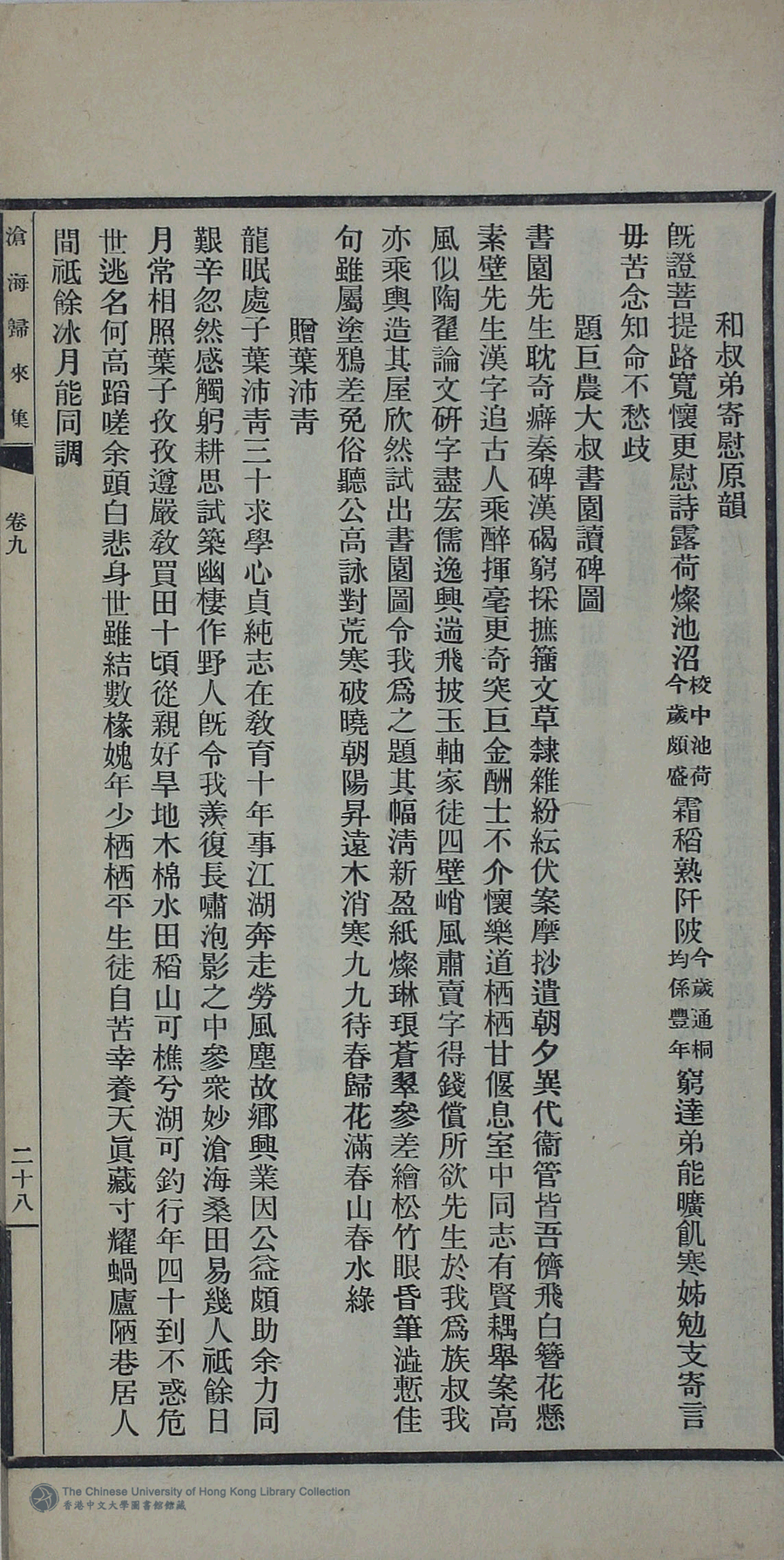 | (PRINT FRIENDLY VERSION) 滄海歸來集:詩十一卷,詞一卷,續集一卷,餘卷二卷,消愁吟二卷,文一卷(清姚倚雲撰)。民國三十三年(1944)或其後排印本 ![]() 頁碼 : 詩9.28a | 点 击 放 大 | 返回 |