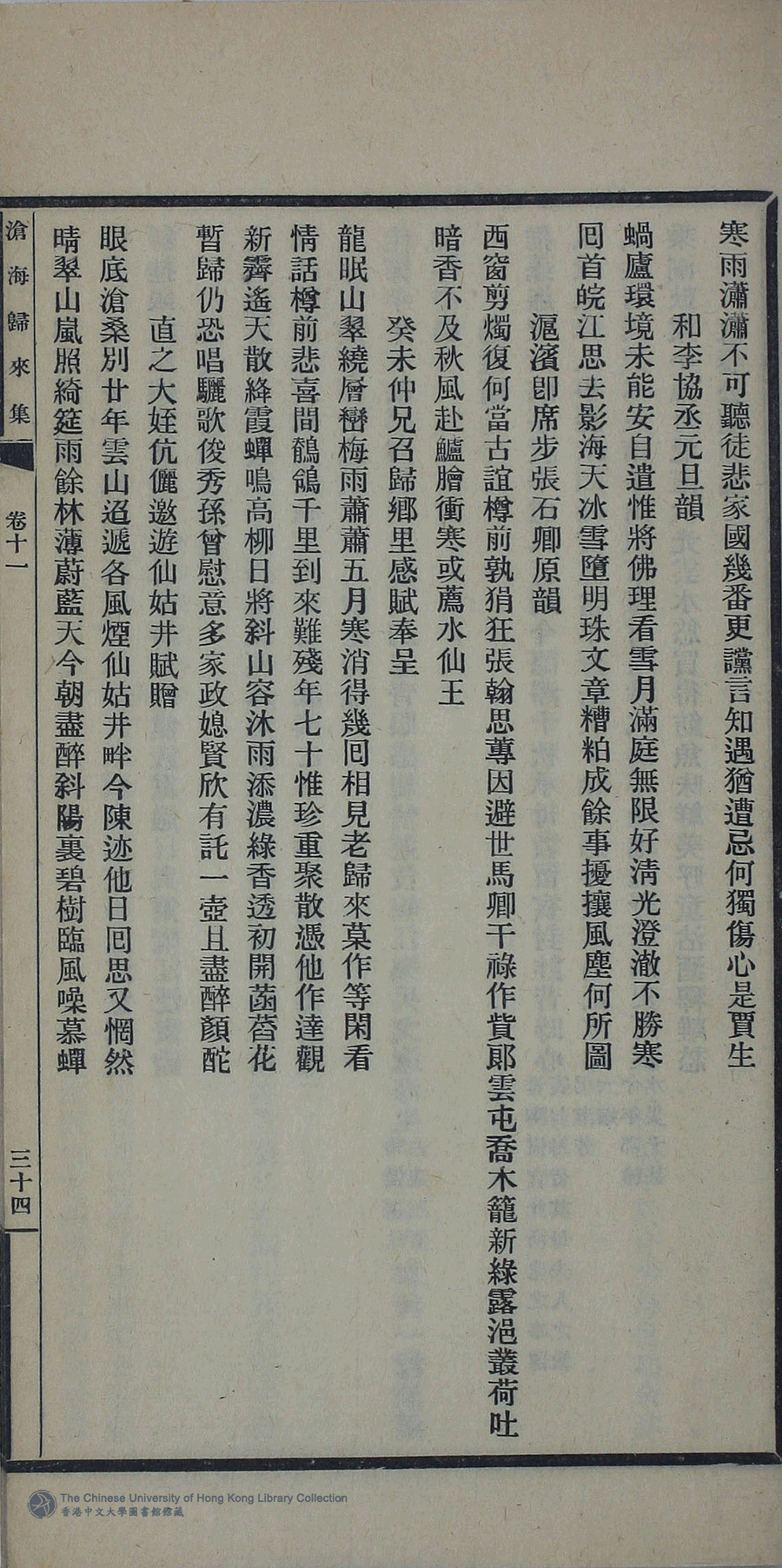 | (PRINT FRIENDLY VERSION) 滄海歸來集:詩十一卷,詞一卷,續集一卷,餘卷二卷,消愁吟二卷,文一卷(清姚倚雲撰)。民國三十三年(1944)或其後排印本 ![]() 頁碼 : 詩11.34a | 点 击 放 大 | 返回 |