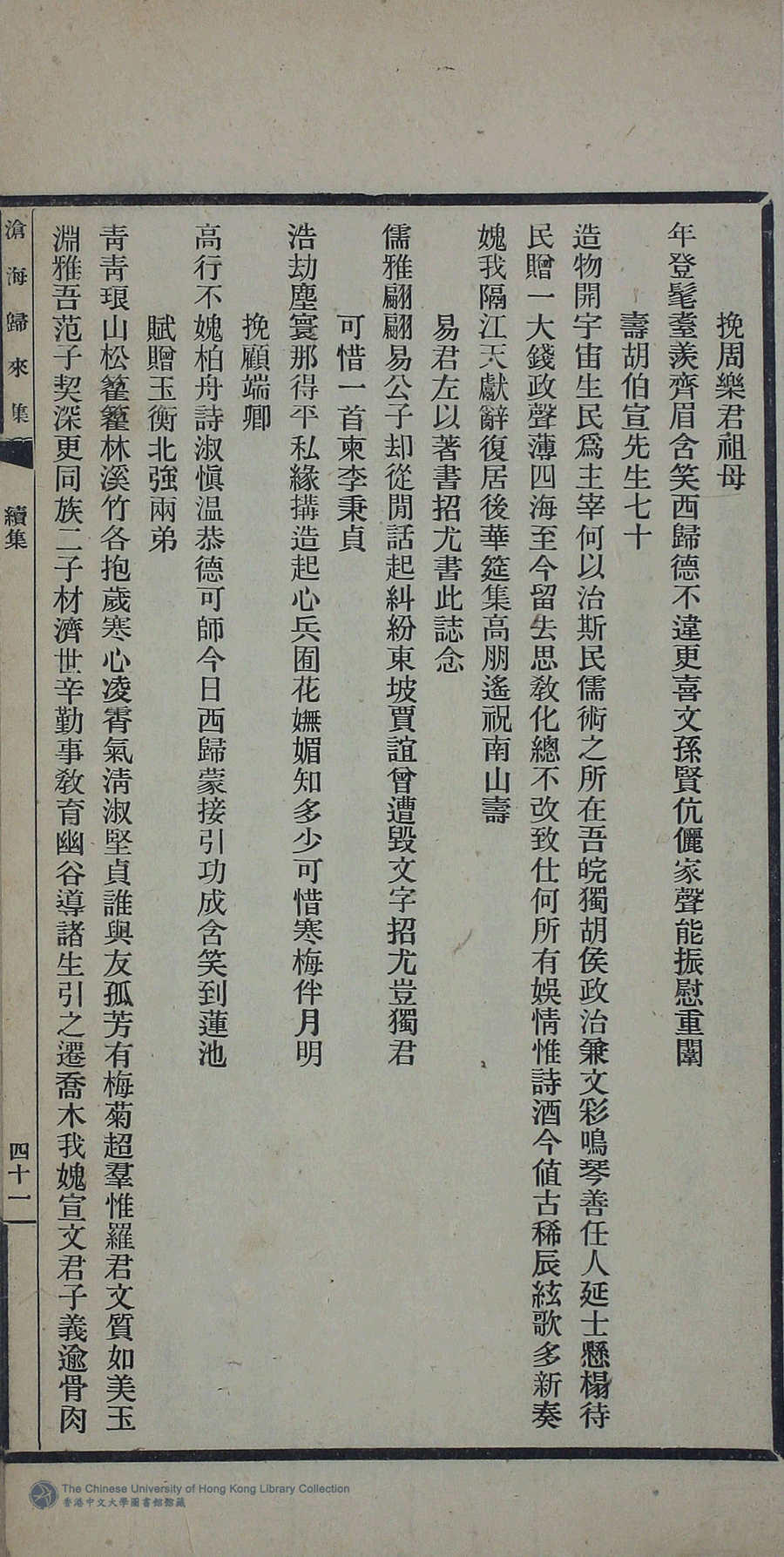 | (PRINT FRIENDLY VERSION) 滄海歸來集:詩十一卷,詞一卷,續集一卷,餘卷二卷,消愁吟二卷,文一卷(清姚倚雲撰)。民國三十三年(1944)或其後排印本 ![]() 頁碼 : 續集.41a | 点 击 放 大 | 返回 |